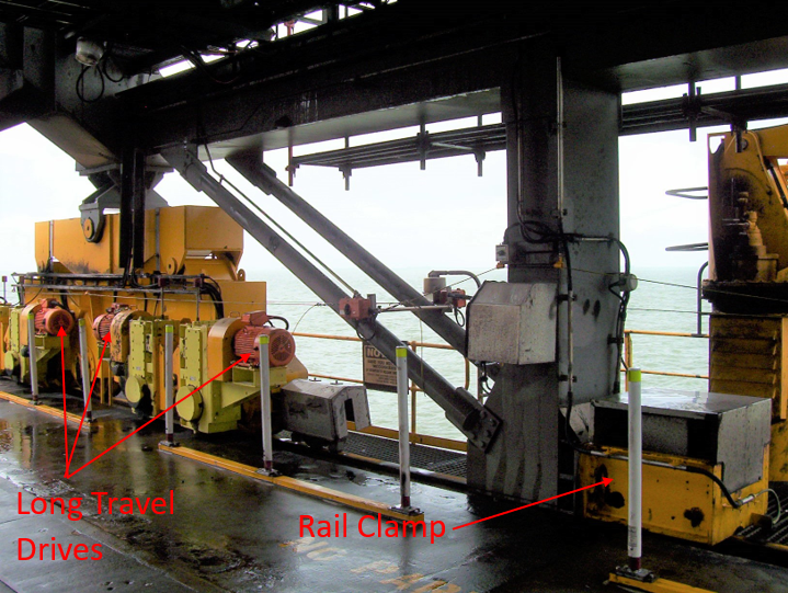 Figure 5 shows the long travel drive system and rail clamp on a ship loader at a bulk loading port. Brakes on the long travel drives and rail clamps can be engaged to resist forces when the machine is stopped. The designer needs to ensure that the combination of the long travel brakes and rail clamps have sufficient capacity to hold the machine in the event of a sudden storm event. Maintenance of the systems is important to ensure that the brakes and rail clamps remain in adjustment. Quite often one or more of the drives and brakes are removed for maintenance in the workshop and it is important that there is redundancy in the system to allow for such.